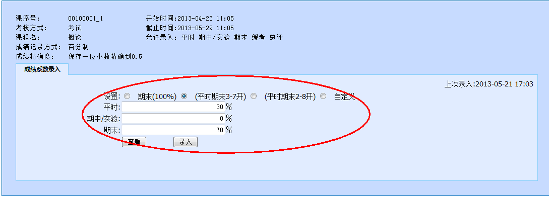 4、点击总评成绩录入, 进入总评成绩录入 .(总评成绩用于期末成绩的录入,可录入平时成绩、期中成绩和期末成绩,自定义三者组成比例)