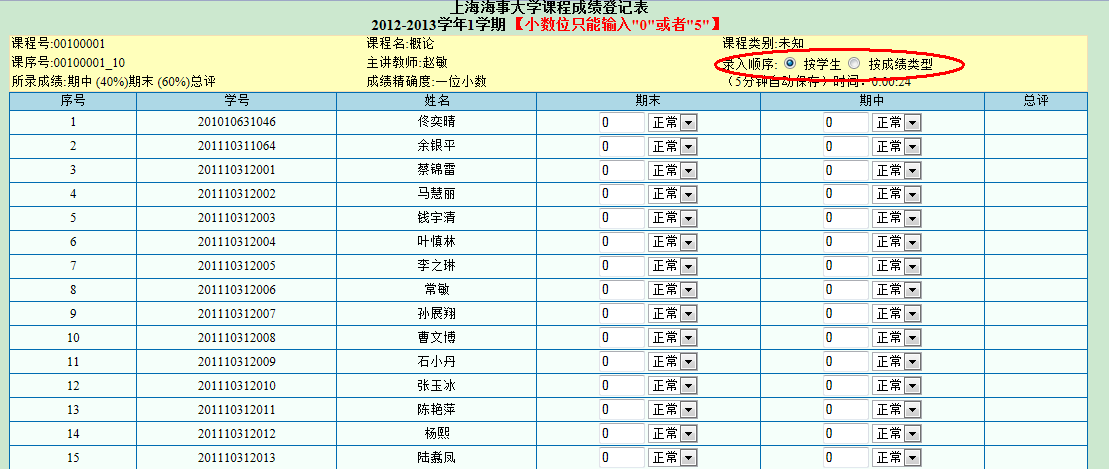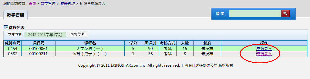 4.3、成绩录入 :如果此时出现的学生名单与您手中的成绩登记表的名单不符,请马上与教务信息管理中心联系(021-38284272)